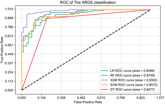 In this work, five machine learning algorithms, including LR, RF, XGB, SVM, and DT, are used to predict the occurrence of ARDS in SAP. The prediction effects of the models are excellent through the evaluation of some indicators. Among them, the XGB model has been proven to have the best all-around prediction performance because its AUC value reaches 0.93. Other indicators, such as accuracy and precision, are significantly better than the other four models. The XGB model is an optimized distributed gradient lifting library with high efficiency, flexibility, and portability advantages. Based on this, Le et al. [10] independently verified the value of the XGB model in the early prediction of ARDS. They found that the AUC value of the XGB model reached 0.827, 0.810, and 0.790, respectively, when tested for the detection of ARDS at 12 h, 24 h, and 48 h prior to onset. The AUC values obtained in the above studies were slightly lower than ours, which may be because the investigators did not optimize the characteristic variables. Noise in the data may lead to instability between the model and its predicted results, thereby reducing the generalization of its effects [24]. Another study that predicted the duration of mechanical ventilation in patients with ARDS also found that the XGB model stood out among many models and exhibited the most stable and accurate performance, called the “optimal model” by the authors [33].