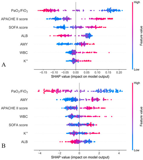 However, integrated learning methods such as RF and XGB, while effective, have not been able to address the issue of interpretability. On the other hand, SHAP values happen to be an effective way of interpreting the model ex-post, revealing what the model understood when it made the correct judgment. Typically, a more significant SHAP value for a feature indicates that it has a more significant impact on the model. This study, therefore, incorporates the concept of SHAP values to rank the importance of the features in the best-performing RF and XGB models to reveal the essential feature variables influencing both models (Figure 2). According to the SHAP value distribution of each feature, the crucial features that accounted for more than 80% of the importance in both models were intersected to obtain seven main features: PaO2/FiO2, APACHE II, SOFA, ALB, AMY, K+, and WBC, which formed the new dataset.