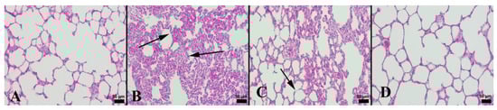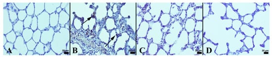 Histopathological appearance of the lungs in study groups: (A) normal microscopical appearance in lungs in a rat belonging control group; (B) marked increase in septal tissue thickness (arrows) in lungs in a rat from LPS group; (C) marked amelioration and decreased septal tissue thickness (arrow) in a rat in LPS + NBL group; and (D) normal lung tissue architecture in a rat belonging NBL group, H&E, scale bars = 50 µm.