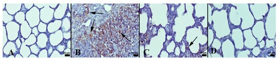 ICAM-1 expressions between the groups: (A) negative expression in control group; (B) increased expression (arrows) in alveolar cells (arrows) in LPS group; (C) decreased expression (arrow) in LPS + NBL group; and (D) negative expression in NBL group, Streptavidin biotin method, scale bars = 20 µm.