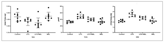 OSI levels were slightly higher in the LPS (p < 0.001) and LPS + NBL groups (p < 0.01) compared to the negative controls. OSI levels were noticeably lower (p < 0.01) in LPS plus NBL-exposed animals compared to only LPS exposure. In only the NBL-administered group, OSI values were considerably lower compared to the LPS and LPS + NBL groups (p < 0.001 and p < 0.05, respectively). See Figure 4.