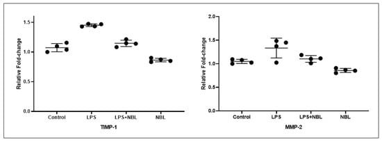 MMP-2 levels were noticeable higher in the LPS group than in the control, LPS + NBL, and NBL groups (p < 0.001 for all). In addition, MMP-2 levels were higher in the LPS + NBL group than in the control and NBL groups (p = 0.042 and p < 0.001, respectively). MMP-2 levels were considerably lower only in the NBL-administered group than in the control (p < 0.001). See Figure 5.
