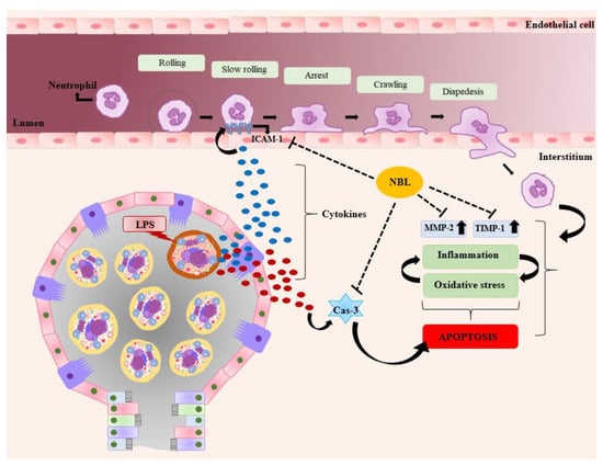 Briefly, NBL suppressed inflammation, oxidative stress, and apoptosis in LPS-induced ALI and prevented the extravasation of leukocytes by decreasing ICAM-1, TIMP-1, and MMP-2 expression (see Figure 6).