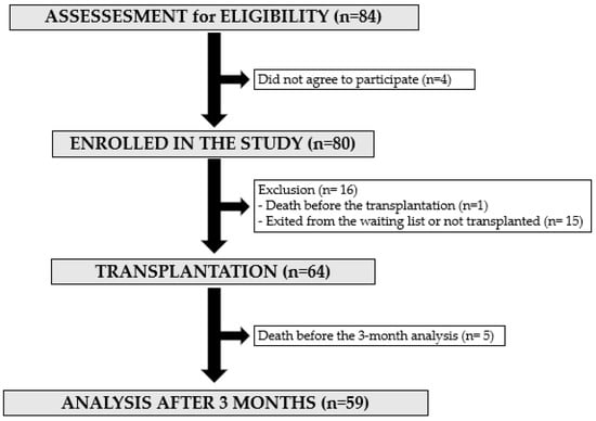 The study took place from May 2017 (beginning of inclusions) to September 2020 (last evaluation), 84 patients were approached for participation. Eighty patients gave their consent to the study and were included, 64 were transplanted and 59 were evaluated three months after transplantation (Figure 2).