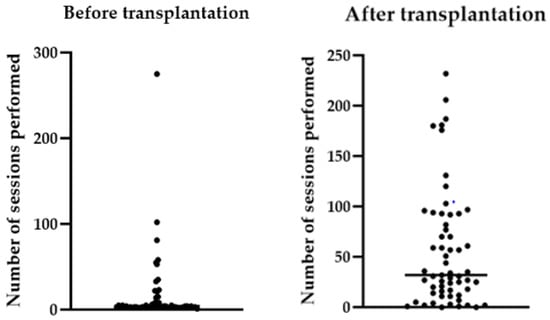 The number of sessions performed by each patient before and after transplantation is reported in Figure 3.