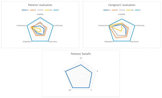Patients’ and caregivers’ assessments of the techniques at the end of the study are reported as a radar presentation. It summarizes their assessments according to the five studied features (Figure 4), details are available in Table 3.