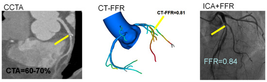 - Nørgaard, B.L.; Hjort, J.; Gaur, S.; Hansson, N.; Bøtker, H.E.; Leipsic, J.; Mathiassen, O.N.; Grove, E.L.; Pedersen, K.; Christiansen, E.H.; et al. Clinical Use of Coronary CTA-Derived FFR for Decision-Making in Stable CAD. JACC Cardiovasc. Imaging 2017, 5, 541–550. [Google Scholar] [CrossRef]
