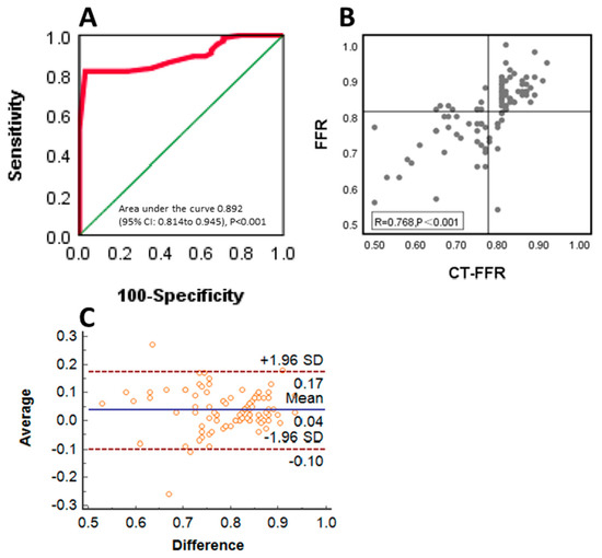 Receiver operating characteristic (ROC) curve (A), linear correlation plot (B), and Bland–Altman plot (C) of resting CT-FFR vs. FFR on a per-vessel basis.