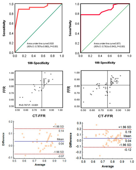 Receiver operating characteristic curve (ROC), linear correlation plot, and Bland–Altman plot comparing CT-FFR vs. FFR on a per-vessel basis in the (left-hand) normal and (right-hand) dysfunction subgroups in left ventricular diastolic function separately.