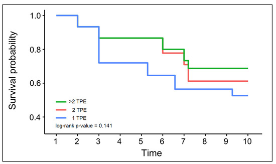 Kaplan–Meier survival analysis by number of TPE sessions. Time was measured in days.
