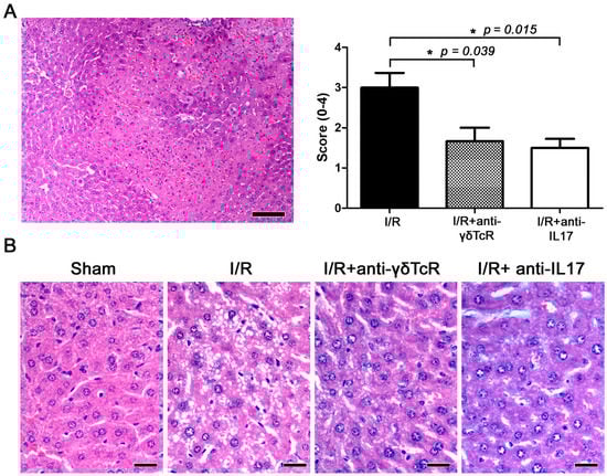 The liver lobes of mice that underwent experimental I/R had the standard array of I/R-induced histopathological lesions, including occasional areas of massive necrosis, multifocal congestion, hepatic cell vacuolar degeneration and necrosis (Figure 1A,B). The same liver lobes of sham-treated mice had normal histology (Figure 1B). The livers of mice that were pretreated with anti-γδ-TcR or anti-IL-17 antibodies before I/R induction showed ameliorated histopathology in comparison with their nonpretreated counterparts. To further support this observation, we scored the severity and extent of histopathological lesions in the mouse livers. The statistical analysis of histopathology scores supported our observation by yielding statistically significant effects of both anti-inflammatory treatments in suppressing IRI (Figure 1A,B).