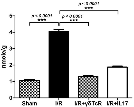To confirm this result, we next determined levels of MDA, a well-accepted index of lipid peroxidation and cell injury, in the livers of mice. Liver biochemistry results were in line with pathology since there was a statistically significant MDA elevation in I/R mice compared to the sham-operated controls. Furthermore, the neutralization of either γδTcR or IL17a prior to I/R reduced MDA at statistically significant levels (Figure 2).