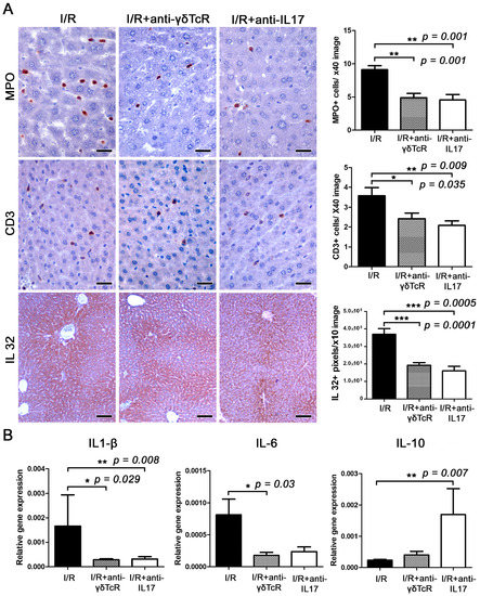 The neutralization of either γδTcR cells or IL17a suppresses I/R-associated inflammation. (A) The liver tissue after I/R is infiltrated by MPO+ neutrophils and CD3+ T-lymphocytes. The numbers of MPO+ and CD3+ cells are significantly less in both groups of mice receiving pretreatments. Large amounts of IL-32 localize primarily in the centrilobular zone but often expand to include the whole lobule and create a central-to-central bridging staining pattern. The expression levels of IL-32 are significantly lower in the livers of pretreated mice. (B) Quantitative cytokine gene expression analysis of mouse liver shows that pretreatments suppressed the expression of proinflammatory cytokines IL-1β and IL-6 and upregulated the anti-inflammatory cytokine IL-10. The effect was statistically significant. (A) Diaminobenzidine chromogen, haematoxylin counterstain. Scale bars: 25 μm (MPO and CD3); 100 μm (IL-32). (A,B) Numbers on the Y-axis of bar graphs correspond to the mean ± SEM of the parameters assessed. * p < 0.05, ** p < 0.01*** p < 0.001.