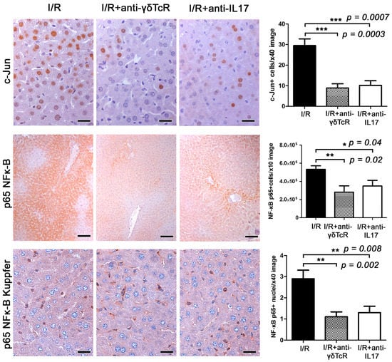 Anti-γδTcR and anti-IL17a pretreatments downregulate c-Jun and NF-κB p65 in the liver of mice with I/R-injury. A high number of cells have a nuclear localization of c-jun in affected liver areas. In comparison with I/R controls, c-jun-positive hepatocyte nuclei are significantly reduced in pretreated mice. Likewise, cytoplasmic NF-κB p65 in hepatocytes is also reduced. In nonparenchymal liver cells comprising mostly Kupffer cells, there is both cytoplasmic expression and nuclear translocation of NF-κB p65. The latter is significantly reduced in the mice receiving pretreatments. Diaminobenzidine chromogen, haematoxylin counterstain. Scale bars: 25 μm (c-Jun and NF-κB p65); 100 μm (NF-κB p65 Kupffer). The Y-axis of bar graphs depicts the mean ± SEM of IHC-labelled cells or pixel counts in high-power magnification images. * p < 0.05, ** p < 0.01 and *** p < 0.001.