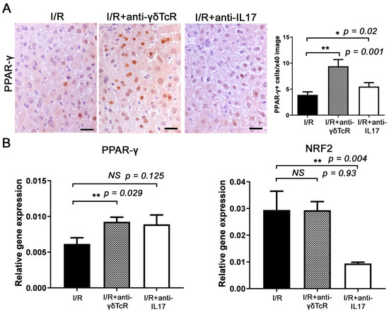 Anti-γδTcR and anti-IL17a increase PPAR-γ and reduce NRF-2 in the livers of mice with I/R-injury. (A) Hepatocytes with a nuclear PPAR-γ-positive immunohistochemical signal are more significantly present in the livers of pretreated mice in comparison with the controls. (B) Quantitative PPAR-γ gene expression analysis in mouse livers parallels the result of immunohistochemistry. The same analysis shows that the anti-IL17a but not the anti-γδTcR pretreatment correlates significantly with NRF-2 reduction in mouse livers after I/R injury. (A) Diaminobenzidine chromogen, haematoxylin counterstain. Scale bars: 25 μm (A,B) Neutralization of either γδTcR cells or IL17a. * p < 0.05, ** p < 0.01. NS, Nonsignificant.