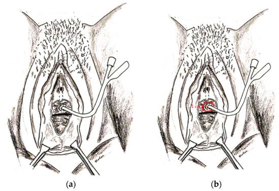 (a) Once obtained enough free space distally to the insertion of the catheter in the bladder, a circumferential incision of the vesical part of the VVF around the catheter followed with full resection of the tissue was performed. The bladder was then sutured in two layers helped by traction on the catheter to pinpoint the margins of the hole. (b) The bladder was completely sutured after deflation of the Foley. The Foley catheter was removed by deflating the balloon before the first suture was tied. Then, the vagina was sutured with intra-corporeal knots.