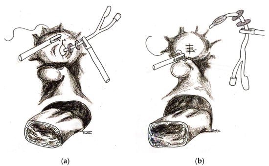 After that, the laparoscopy was started with pneumoperitoneum followed by 1 × 10 mm non-disposable port (Karl Storz, Tuttlingen, Germany) in the umbilicus and 3 × 5 mm ports in the lower abdomen. After adhesiolysis, the vaginal vault was exposed by vaginal pressure exerted with use of a gauze pad or bowel dilator inserted into a glove to maintain the pneumoperitoneum (Figure 2a,b).