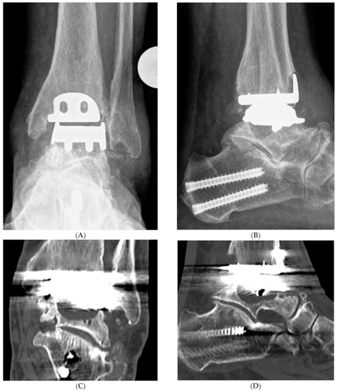 - Dunbar, M.J.; Fong, J.W.; Wilson, D.A.; Hennigar, A.W.; Francis, P.A.; Glazebrook, M.A. Longitudinal Migration and Inducible Displacement of the Mobility Total Ankle System. Acta Orthop. 2012, 83, 394–400. [Google Scholar] [CrossRef]