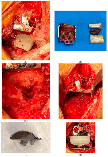 Hybrid Total Ankle Arthroplasty (H-TAA). This figure represents Case Nr. 7 of the cohort (see Table 1, Table 2 and Table 3). (A–D): Preoperative X-rays and CT-scans depicting the cyst under the talar component of the Hintegra TAA. (E,F): Intraoperative pictures showing the inlay breakage with poor bone osteointegration in the backside of the talar component of the Hintegra TAA. (G): Talar cyst with stable tibial Hintegra component. (H): Performance of a flatcut of the talus and bone grafting of the talar cyst with iliac crest autologous spongiosa. (I): Flatcut Talar Component of the VANTAGE TAA, which is implanted on the reconstructed talus. (J): H-TAA: Tibial component Hintegra TAA with new Flatcut Talus and Inlay of VANTAGE TAA. (K,L): Postoperative X-rays with H-TAA, good talar bone reconstruction, and good integration of the Flatcut Talus of VANTAGE TAA.