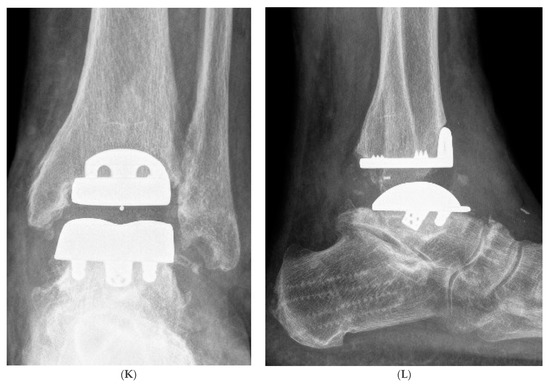 - Alsayel, F.; Alttahir, M.; Wiewiorski, M.; Barg, A.; Herrera, M.; Valderrabano, V. Two-Staged Revision Total Ankle Arthroplasty Surgery with Primary Total Ankle Arthroplasty System: A Case Report. JBJS Case Connect. 2021, 11, e20. [Google Scholar] [CrossRef]