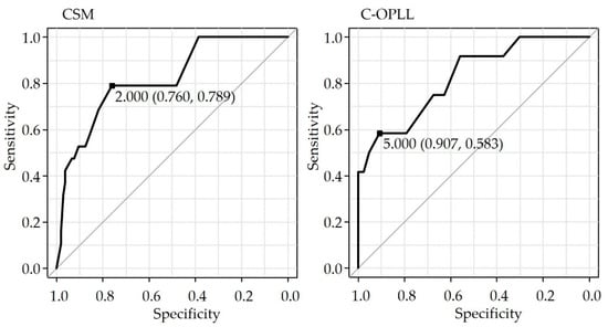 ROC curve. C-OPLL, Ossification of the posterior longitudinal ligament of the cervical spine; CSM, cervical spondylotic myelopathy.
