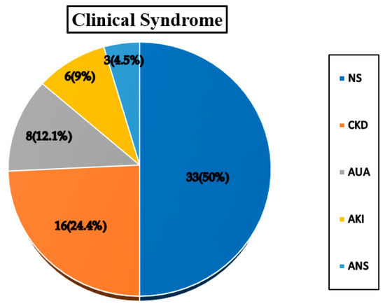 Presenting clinical syndrome in patients with type 2 diabetes mellitus (n = 66). NS: Nephrotic Syndrome, CKD: Chronic kidney Disease, AUA: Asymptomatic Urinary Abnormality, AKI: Acute Kidney Injury, ANS: Acute Nephritic Syndrome.