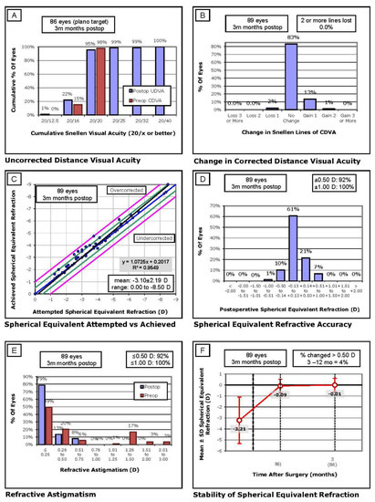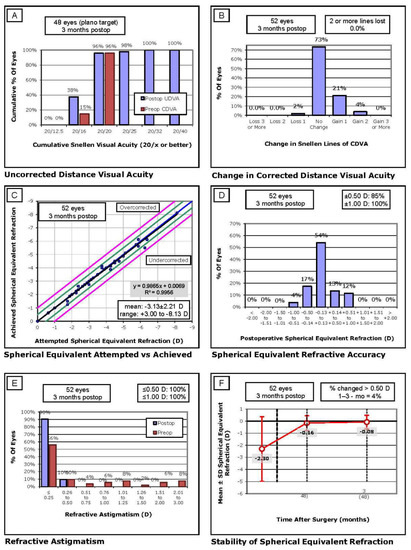 Visual and Refractive Outcomes in the LASIK group. (A) Uncorrected distance visual acuity, (B) Changes in corrected distance visual acuity, (C) Spherical equivalent attempted refraction versus achieved refraction, (D) Spherical equivalent refractive accuracy, (E) Refractive astigmatism outcomes distribution, (F) Stability of spherical equivalent refraction.