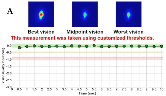 Optical quality metrics of the patients eye and tear film dynamic changes were assessed using a double-pass (DP) aberrometer system and tear film analysis software (HD AnalyzerTM; Visiometrics, Spain) [8]. A 780 nm wavelength laser diode is emitted on the retina and DP through the ocular media, after which a charge-coupled camera device records the light reflection. A personal computer was used to process the retinal images and collect data. The DP images were acquired at best focus and corrected internally by an optometer that ranged from −8.0 to +6.0 diopters (D). Astigmatism was corrected using an appropriate cylindrical lens placed in front of the eye. All measurements were performed by the same experienced technician, starting with the right eye. The objective scatter index (OSI) is a parameter that allows objective evaluation of intraocular scattered light. It was computed by evaluating the amount of light on the periphery (circle of radius between 12 and 20 min of arc) in relation to the amount of light in the central peak of the DP image [15]. Higher intraocular scatter was correlated with higher OSI values. For reference, normal OSI values in a healthy and myopic population have been reported to vary between 0.46 to 1.3 [16,17]. The point spread function (PSF) represents an image projected onto the retina from a point light source. The MTF, directly computed from the PSF, represents the attenuation percentage of the contrast of the retinal image at various resolutions (spatial frequencies), including the combined effects of scattering and high-degree optical aberrations. The value considered in this study was the cutoff point of the MTF curve on the x-axis, which represents the point at which the spatial frequency is at its maximum. The results are presented in cycles per degree. Normal MTF values in a healthy and myopic population have been reported to vary between 53.3 to 31.1 cycles per degree (the higher, the better contrast image quality) [16,17]. The SR is a quantitative measurement of the optical quality of the eye. It can be calculated as the ratio of the peak intensity of the eye’s PSF image from a point source to the maximum attainable intensity using an ideal optical system limited only by diffraction over the system’s aperture [15]. Thus, it is a figure between zero and one. Again, the higher the value, the better the optical quality. As a reference, a normal young eye with a pupil diameter of 4 mm has an SR of approximately 0.3 [7].