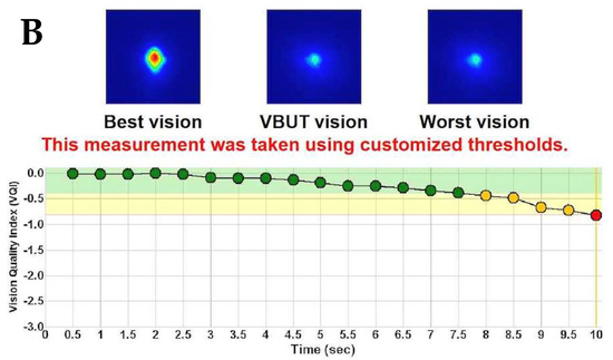 The tear film analysis software records dynamic changes in the optical quality through fluctuation of the OSI every 0.5 s while the subject is instructed to avoid blinking. This metric is called the visual break-up time (VBUT) and translates the stability of the visual quality between the two blinks. VBUT is defined as the time between the beginning of the measurement and the time at which the patient’s OSI value deteriorates (increased by 0.5) due to tear film dynamic alterations [13]. Therefore, the VBUT overall duration, which is in other terms the time during which the patient can experience an optimal optical quality vision (preserved point spread function), can be translated into the patient’s “functional visual acuity”.