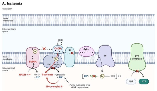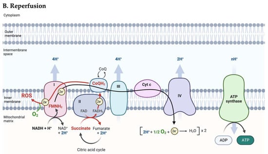 The first damaging event upon reperfusion is a burst of ROS production. Previously, ROS production was thought to be due to nonspecific dysregulation of the electron transport chain level, with electrons leaking at multiple nonspecific sites when oxygen was reintroduced. However, Chouchani et al. identified a conserved specific metabolic pathway in which ROS are generated by reverse electron transport (RET) at complex I of the electron transport chain (Figure 2) []. This process is a universal metabolic signature in a wide range of tissues (heart, liver, brain, kidney) and produces far more superoxide than any other mitochondrial process. A detailed review of the mechanism of RET and mitochondrial ROS production has been written []. In summary, RET occurs when electrons are forced backward through complex I from where they reduce oxygen to superoxide (•O2−), which is the precursor to most other ROS, including hydrogen peroxide (H2O2), hydroxyl ion (OH−), and hydroxyl radical (•OH). This reaction is driven by the accumulation of succinate during ischemia due to the reverse action of succinate dehydrogenase (SDH) or complex II, an enzyme that participates both in the citric acid cycle and the electron transport chain []. The accumulation of succinate is driven by the buildup of (1) NADH that transfers electrons to the CoQ pool via complex I and (2) fumarate by the degradation of AMP among other pathways [].