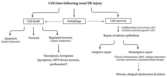 Possible cell fates following ischemia–reperfusion injury. MPT, mitochondrial permeability transition; EMT, epithelial-to-mesenchymal transition.