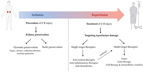 Often, post-transplant graft dysfunction (i.e., DGF) is considered to be the consequence of the reperfusion injury due to the various deleterious processes described above (oxidative stress, endothelial dysfunction, immune system activation…). Nevertheless, recipients of living donors experience only rarely graft dysfunction despite the kidney graft being exposed to reperfusion. This indicates the important contribution of the preceding ischemic insult in the manifestation of clinical I/R injury. Therefore, prevention of I/R injury would consist of abrogating (the processes of) ischemia, which is achieved through improving kidney preservation. Treatment of I/R injury involves therapies that target the consequences of reperfusion injury (Figure 4).