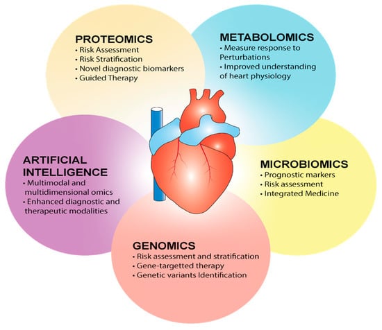 Most CVDs stem from a complex interplay of modifiable and non-modifiable factors which aggravate the set “omic” predisposition. In contemporary cardiology, most diagnostic criteria and therapeutic approaches rely on population-based studies, with less focus on approaches tailored to individualize patient treatment []. As such, a comprehensive analysis of phenotypes and the “omics” can help cluster patient groups sheathing disparities, simultaneously reinforcing patient-centric clinical care. Further, it will enhance patient quality of life (QOL) and help reduce complications via novel biomarkers, improved AI-assisted diagnostics, targeted therapeutics, and appropriate long-term risk assessment [].