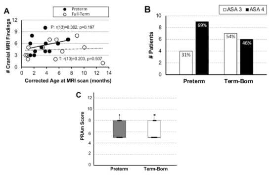 Although critical illness in infancy has been known to be associated with neurocognitive morbidities [35], our report represents the first attempt to assess the relationship between ASA classification and PRAm scores with cranial MRI findings. Our study failed to show any association between either ASA or PRAm scores and cranial MRI findings for either term-born or early-to-late preterm infants (Figure 2). Furthermore, our results indicate that PRAm scoring may be of limited use in the selected cohort of infants born with LGEA, despite being introduced as a novel scoring system specifically designed for predicting perioperative risk of mortality in pediatric populations undergoing noncardiac surgery [36]. In contrast, ASA classification supports that premature infants were more critically ill in comparison to term-born infants in our pilot cohort. Indeed, it is widely known that prematurity is a confounding factor in critical illness (with various morbidities) [37], including neurologic and neurocognitive sequelae [38], but future studies are needed to rule out prematurity in relation to brain findings in the context of complex perioperative critical care as part of the Foker process [7,8,9]. The lack of association between ASA classification and brain findings, despite documented incidental clinically significant MRI findings [10] and smaller brain and CC volumes [10,18,20], probes for (i) a study with larger power and/or (ii) a future new scoring metric in order to expand on previous risk stratification in this unique patient population. Future studies should also explore the usefulness of other scoring tools (viz. pediatric risk of mortality score (PRISM) [39], pediatric logistic organ dysfunction score (PELOD) [40], and pediatric multiple organ dysfunction score (P-MODS) [41] in assessing risk of brain findings.