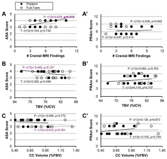 Despite moderate associations between ASA scores and brain MRI metrics in early-to-late preterm infants, we did not show any significant relationship in either preterm or term-born infant patients (Figure 2A–C). Similarly, there is no association between PRAm scores and cranial MRI findings, irrespective of the gestational age group (Figure 2A′–C′).