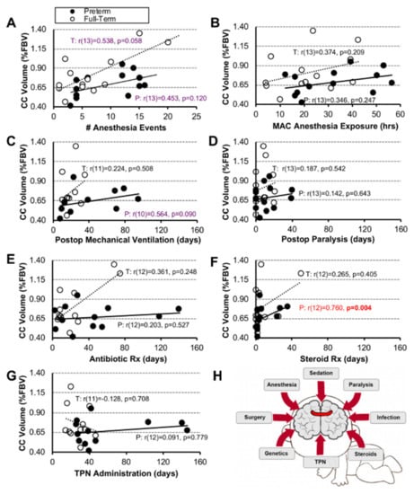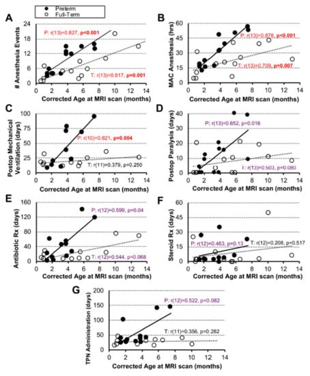 We collected 7 easily quantifiable clinical end-point measures from medical records: (1) number of anesthesia events, and (2) cumulative anesthesia exposure as total minimal alveolar concentration (MAC)-equivalent anesthesia hours up to the time of the research brain MRI. All infants received inhalational agents for maintenance of anesthesia during all procedures. None of the infants underwent total intravenous anesthesia (TIVA) for any procedure. Details of anesthesia management (e.g., administration of inhalational agents with/without peripheral nerve block and/or intravenous pain management) are beyond the subject of this manuscript. We also quantified duration of postoperative treatment (in days) of (3) mechanical ventilation and (4) muscle relaxation (as indirect measures of sedation), as well as (5) antibiotics, (6) steroids, and (7) total parenteral nutrition (TPN) with fat emulsion as an indirect measure of complexity of postoperative care (e.g., surgical complications). All listed data metrics were collected from the perioperative period up until the time of research brain MRI scan. Sedation and weaning management were administered as infusions with boluses. It included combination of opioid (e.g., morphine), benzodiazepine (e.g., midazolam), hypnotic (e.g., ketamine), and/or alpha2-agonist (e.g., dexmedetomidine). Neither sedation nor post-operative muscle relaxation was protocolized. For the few infants that underwent minor procedures at other institutions prior to transfer to our institution for esophageal repair, duration of anesthesia events was estimated (i.e., endotracheal intubation = 0.25 h; placement of central access line = 0.5 h; laparoscopic gastrostomy placement = 1 h), likely resulting in the underestimation of total anesthesia exposure. Due to incomplete availability of outside hospital documentation, comprehensive postoperative intubated sedation/muscle relaxation data were compiled for n = 11/13 term-born infants and n = 10/13 premature infants. Additionally, antibiotic, steroid, and TPN exposure data were only available for n = 12/13 infants per either group. We eliminated only one term-born data point at 12 months of age from correlation analysis as it was considered an aberrant point. This subject underwent extraordinarily long TPN and antibiotic administration that artificially diverted the statistics.