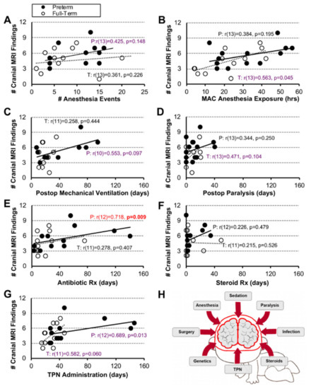 Association Between Clinical Measures and Number of Cranial MRI Findings. Associations between 7 clinical care measures and the number (#) of cranial MRI findings (Panels (A–H) for early-to-late preterm (n = 10–13; black circles, solid trend line) and term-born infants (n = 11–13; open circles, dashed trend line) following long-gap esophageal atresia (LGEA) repair. All correlations were assessed by nonparametric Spearman Rho tests, which are resistant to the effects of outliers. Data were non-normally distributed for clinical measures in Panels (D–G). Strength of correlation is described as weak (r < 0.4; black), moderate (r ≥ 0.4 to <0.7; purple), or strong, (r ≥ 0.7; red) with statistical significance as p < 0.01 (2-tailed). Abbreviations: #, number; MAC, minimal alveolar concentration; P, premature; Postop, post-operative; Rx, treatment; T, term-born; TPN, total parenteral nutrition.