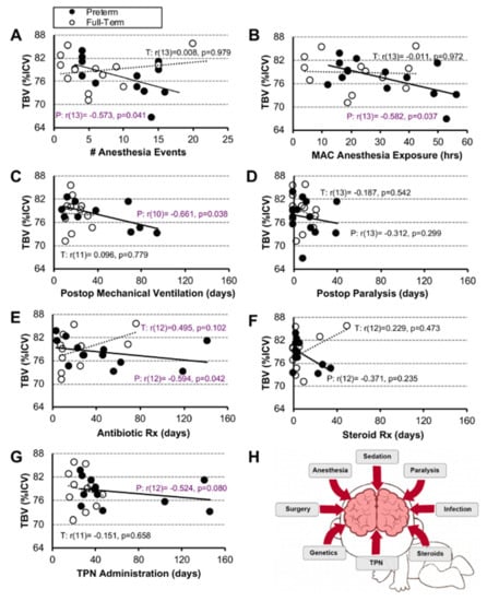 Association Between Clinical Measures and Normalized Total Brain Volume. Panels (A–H) illustrate associations between 7 clinical care measures and normalized total brain volume (TBV as % intracranial volume (ICV)) for early-to-late preterm (n = 10–13; black circles, solid trend line) and term-born infants (n = 11–13; open circles, dashed trend line) following long-gap esophageal atresia (LGEA) repair. We report no significant associations. All correlations were assessed by nonparametric Spearman Rho tests, which are resistant to the effects of outliers. Data were non-normally distributed for clinical measures in Panels (D–G). Strength of correlation is described as weak (r < 0.4; black), moderate (r ≥ 0.4 to <0.7; purple), or strong, (r ≥ 0.7) with statistical significance as p < 0.01 (2-tailed). Abbreviations: #, number; MAC, minimal alveolar concentration; P, premature; Postop, post-operative; Rx, treatment; T, term-born; TBV; total brain volume; TPN, total parenteral nutrition.
