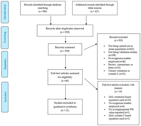 Our search strategy identified 1312 citations, out of which 959 were left after removing 353 duplicates and unrelated papers. We excluded 919 articles after the screening of titles and abstracts, after which 40 studies were left for full-text evaluation. There were 19 [2,8,29,30,31,32,33,34,35,36,37,38,39,40,41,42,43,44,45] full-text articles that were excluded. Finally, 21 studies [9,46,47,48,49,50,51,52,53,54,55,56,57,58,59,60,61,62,63,64,65], which included 11,371 participants consisting of a broad range of values for GFR, were chosen for systematic review. Figure 1 represents the PRISMA flowchart for study selection.