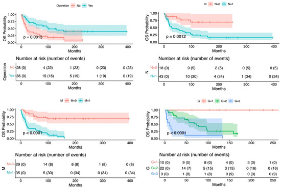 Overall survival related to surgical operation, lymph node metastases, distant metastases, and tumor grade.
