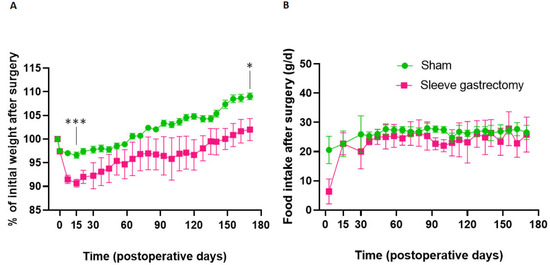 Figure 1 shows the changes in percent preoperative weight and food intake up to 24 weeks postoperatively. Both SG and sham rats experienced maximal weight loss 15 days postoperatively (Figure 1A), with significantly greater weight loss in SG rats than in sham rats (−9.3% versus −4.4% of initial weight, respectively, p < 0.001). Then, weights increased in both groups but remained lower in SG rats compared with sham rats at 24 weeks postoperatively (+2.0% versus +9.0% of initial weight, respectively, p = 0.012).
