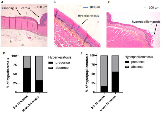 HES staining of the esophageal mucosa of both groups (Figure 2) was classified as healthy esophageal mucosa (Figure 2A), EHK (Figure 2B), or EHP (Figure 2C). EHK and EHP were not significantly different between sham and SG rats (p = 0.32, Figure 2D and p = 0.29, Figure 2E, respectively). No esophagitis or Barrett’s esophagus were observed.