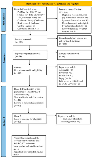 We selected 864 records from PubMed (n = 289), Web of Science (n = 254), Embase (n = 125), Scopus (n = 183), and the Cochrane Library (n = 13). Next, two hundred and fifty-six duplicate records were deleted. A total of 580 records were removed because they did not become relevant to this issue. We then read the full articles of the rest of the 28 records to confirm whether these records met the eligibility criteria in phase 1. We excluded sixteen studies due to the reasons like abstracts, reviews, editorials, replies, or involving patients without SARS-CoV-2 infection. In phase 1, twelve studies were included in the meta-analysis for investigating the IBS prevalence after SARS-CoV-2 infection [19,20,21,22,23,24,33,34,35,36,37,38]. Six studies were excluded in phase 2 because of the absence of a suitable control group. In phase 2, six studies were included in the meta-analysis for investigating the association between IBS and SARS-CoV-2 infection [22,23,34,35,36,38]. The PRISMA study selection flow is given in Figure 1.
