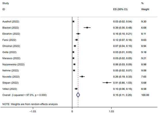The results were based on the data of twelve studies with 3950 individuals from nineteen countries. The prevalence of IBS following SARS-CoV-2 infection is presented in Figure 2. The result of the significance test is displayed in Supplementary Materials S3. The summary prevalence of IBS following SARS-CoV-2 infection was 15% (ES: 0.15; 95% CI, 0.11–0.20; p = 0.000; heterogeneity: p = 0.000; I2 = 97.0%), with the prevalence of each group falling within the range from 3% to 91%.