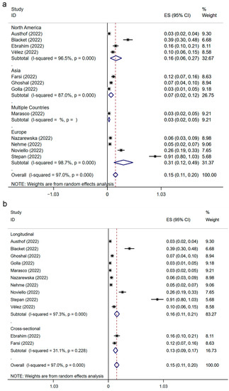 Figure 3. Subgroup analysis of IBS prevalence after SARS-CoV-2 infection [19,20,21,22,23,24,33,34,35,36,37,38]. Forest plots classified by region (a) and study design (b). IBS, irritable bowel syndrome; SARS-CoV-2, severe acute respiratory syndrome coronavirus 2; ES, effect size.