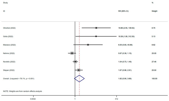 The results relied on data from six studies from fifteen countries with 3595 individuals. The relationship between IBS and SARS-CoV-2 infection is displayed in Figure 4, and the significance test is presented in Supplementary Materials S3. Our observation suggested that SARS-CoV-2 infection was potentially associated with IBS (RR: 1.82; 95% CI, 0.90–3.69; p = 0.096; heterogeneity: p = 0.001; I2 = 76.1%).
