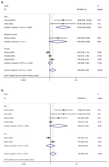Figure 5. Subgroup analysis of the association between IBS and SARS-CoV-2 infection [22,23,34,35,36,38]. Forest plots classified by region (a) and study quality (b). IBS, irritable bowel syndrome; SARS-CoV-2, severe acute respiratory syndrome coronavirus 2; RR, risk ratio.