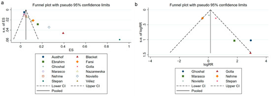 Figure 6. Publication bias evaluation. Funnel plot of the IBS prevalence after SARS-CoV-2 infection (a) [19,20,21,22,23,24,33,34,35,36,37,38]. Funnel plot of the association between IBS and SARS-CoV-2 infection (b) [22,23,34,35,36,38]. IBS, irritable bowel syndrome; SARS-CoV-2, severe acute respiratory syndrome coronavirus 2; ES, effect size; RR, risk ratio.