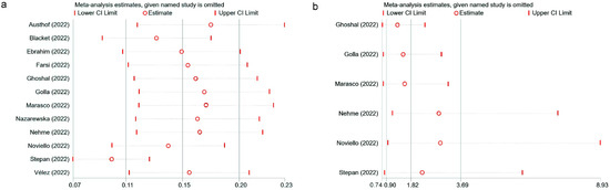 Figure 7. Sensitivity analysis. The IBS prevalence after SARS-CoV-2 infection (a) [19,20,21,22,23,24,33,34,35,36,37,38] and the association between IBS and SARS-CoV-2 infection (b) [22,23,34,35,36,38].