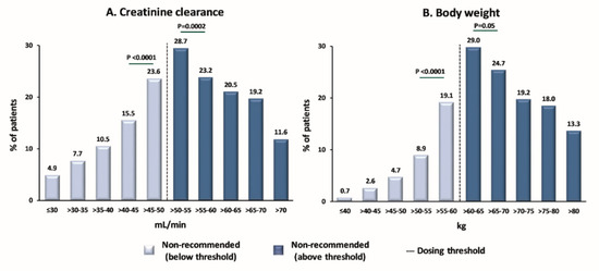 Proportion of patients receiving a non-recommended dose of edoxaban by (A) CrCl category or (B) body weight. The dashed vertical lines indicate the respective dose-reduction thresholds. The thresholds for dose reduction are CrCl ≤ 50 mL/min and body weight ≤ 60 kg, respectively. p-values are included for the category closest to the dosing threshold vs. the next closest category: CrCl 45–50 mL/min vs. CrCl 40–45 mL/min; CrCl 50–55 mL/min vs. CrCl 55–60 mL/min; body weight 55–60 kg vs. body weight 50–55 kg; body weight 60–65 kg vs. body weight 65–70 kg. CrCl, creatinine clearance.